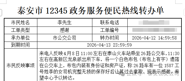 近日,泰安市公共交通有限公司第二分公司 K26 路駕駛員李永妮,在營運(yùn)途中妥善保管乘客遺落的手包并順利歸還失主,用實(shí)際行動踐行拾金不昧的傳統(tǒng)美德,彰顯了公交人的責(zé)任與擔(dān)當(dāng)。失主李先生通過12345政務(wù)服務(wù)便民熱線表達(dá)感謝,并專程送來錦旗,向李永妮致以誠摯謝意。